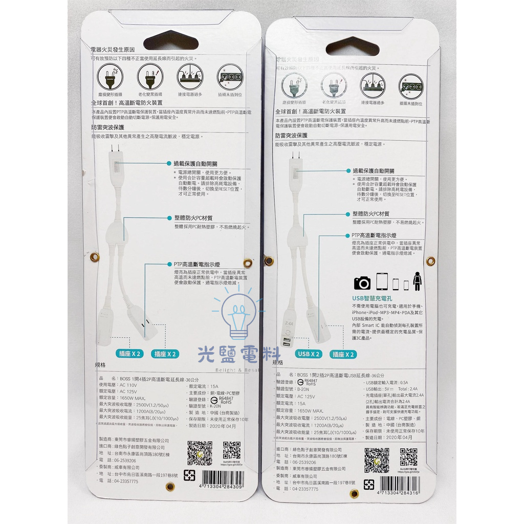 🔺延長線🔺【BOSS】K-20N 1開4插 高溫斷電USB延長線1開2插2 USB 2P 36公分 手機充電