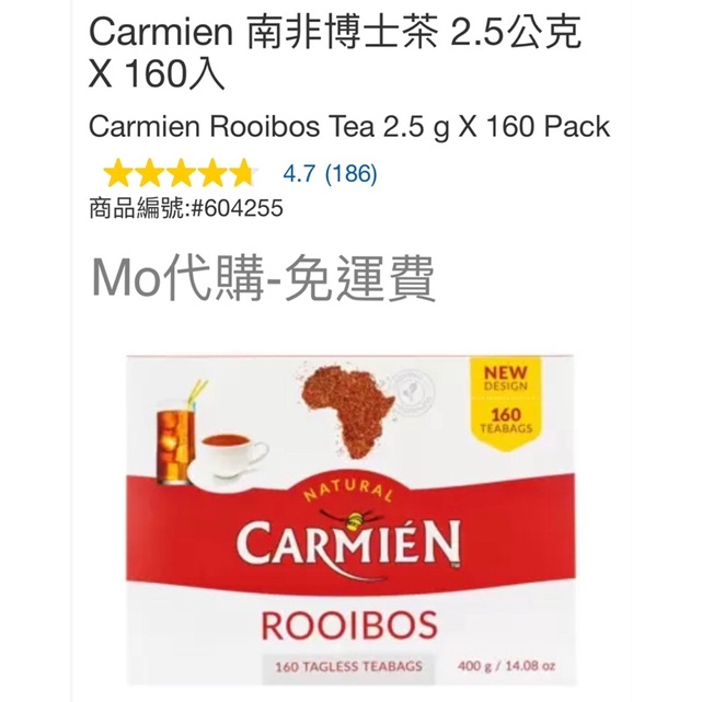 M代購 免運費 好市多Costco Grocery Carmien 南非博士茶 2.5公克 X 160入