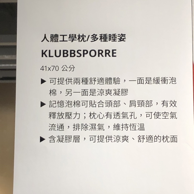 IKEA KLUBBSPORRE 人體工學枕/多種睡姿 適合側睡 偏硬 涼感枕頭 枕頭套另購 記憶泡綿
