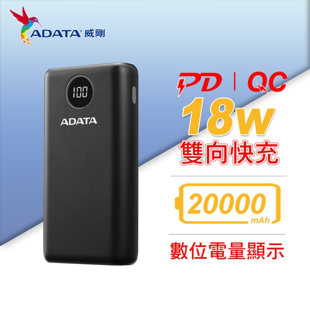 北車【ADATA 威剛】P20000QCD 數位顯示電量 20000mAh 18W PD 快充 QC 3.0 行動電源