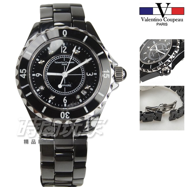 valentino coupeau范倫鐵諾 V61210黑大 陶瓷晶鑽數字時刻 防水手錶 男錶 女錶 陶瓷錶【時間玩家】