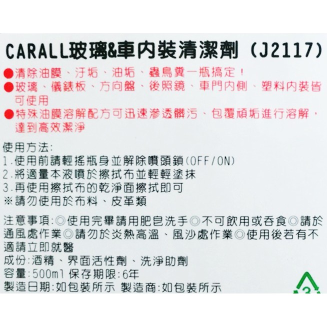 車資樂㊣汽車用品【2117】日本CARALL 噴霧式 玻璃及車內內裝清潔劑 500ml