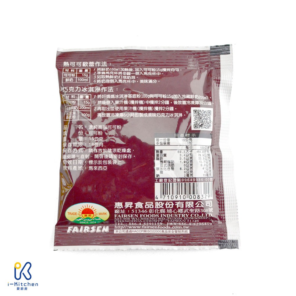 愛廚房~惠昇 好媽媽 濃純高脂可可粉 小包裝(15g) COCOA 可可粉 巧克力粉 烘焙材料