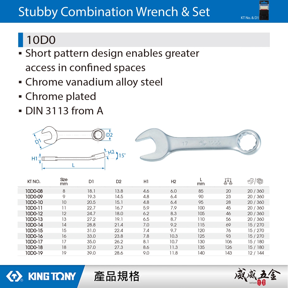 KING TONY 金統立|10D0|8-19mm 短小型設計梅開板手 短版開口板手 迷你板手 短型複合扳手【威威五金】