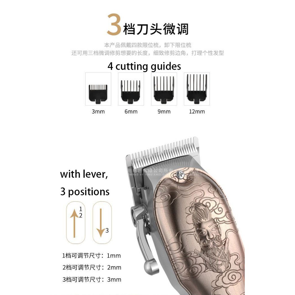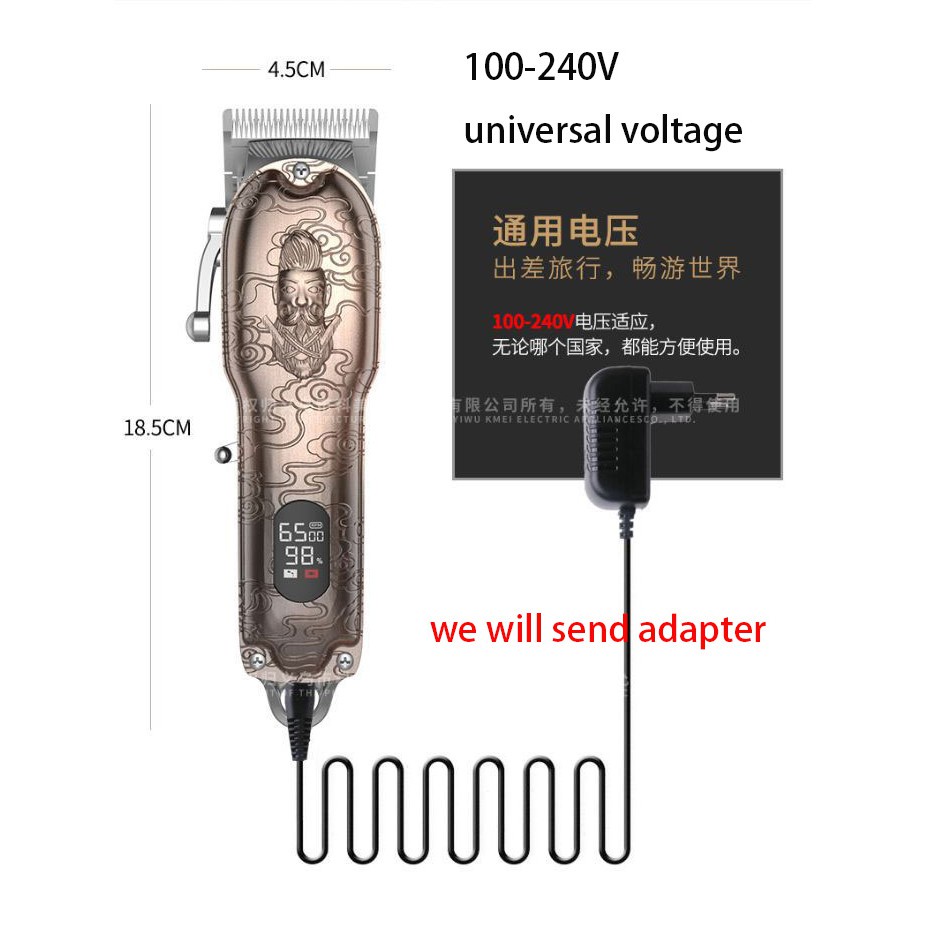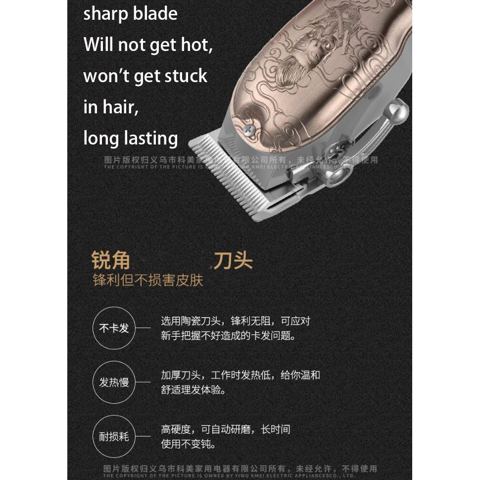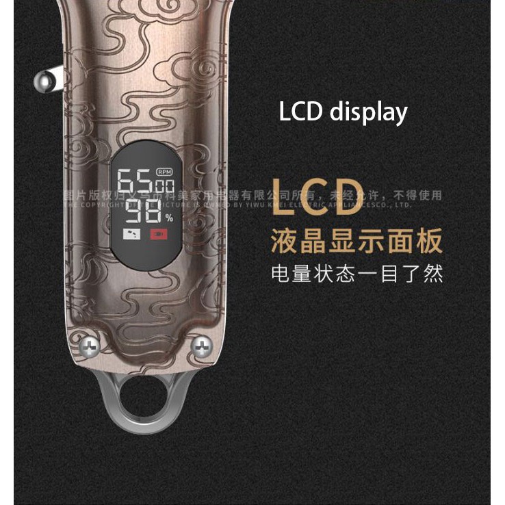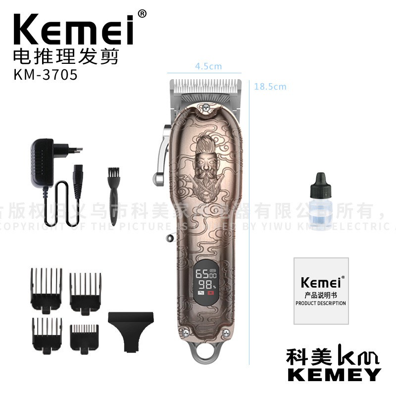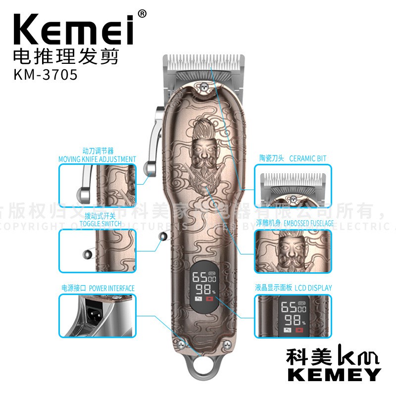 Kemei科美KM-3705理髮器金屬機身復古浮雕鋰電池電推剪发廊理发店油头专用电推子带LCD显示屏台湾电压可用