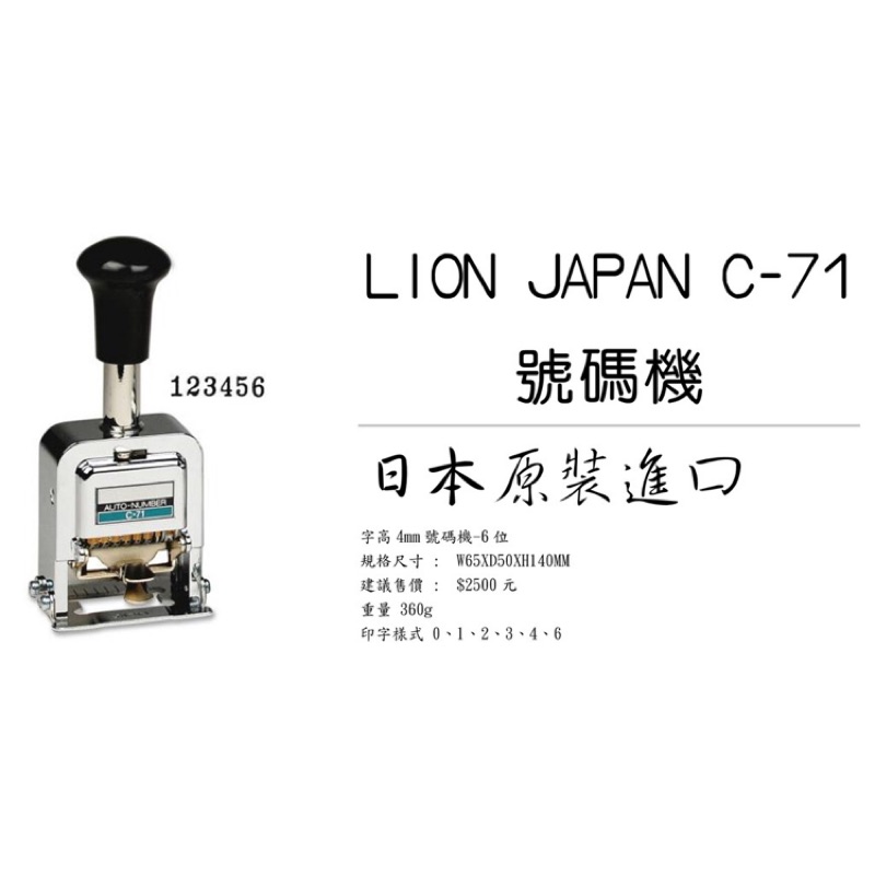 LION 號碼機 C-71自動跳號號碼機自動連續跳號打印機JAPAN製造號碼機數字機打印機6位數字機日本製造加贈2條手環