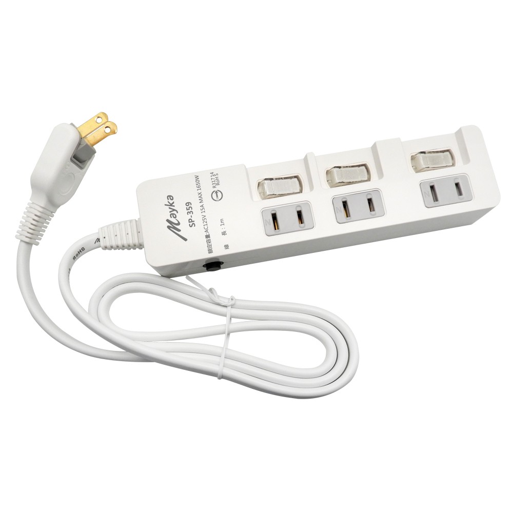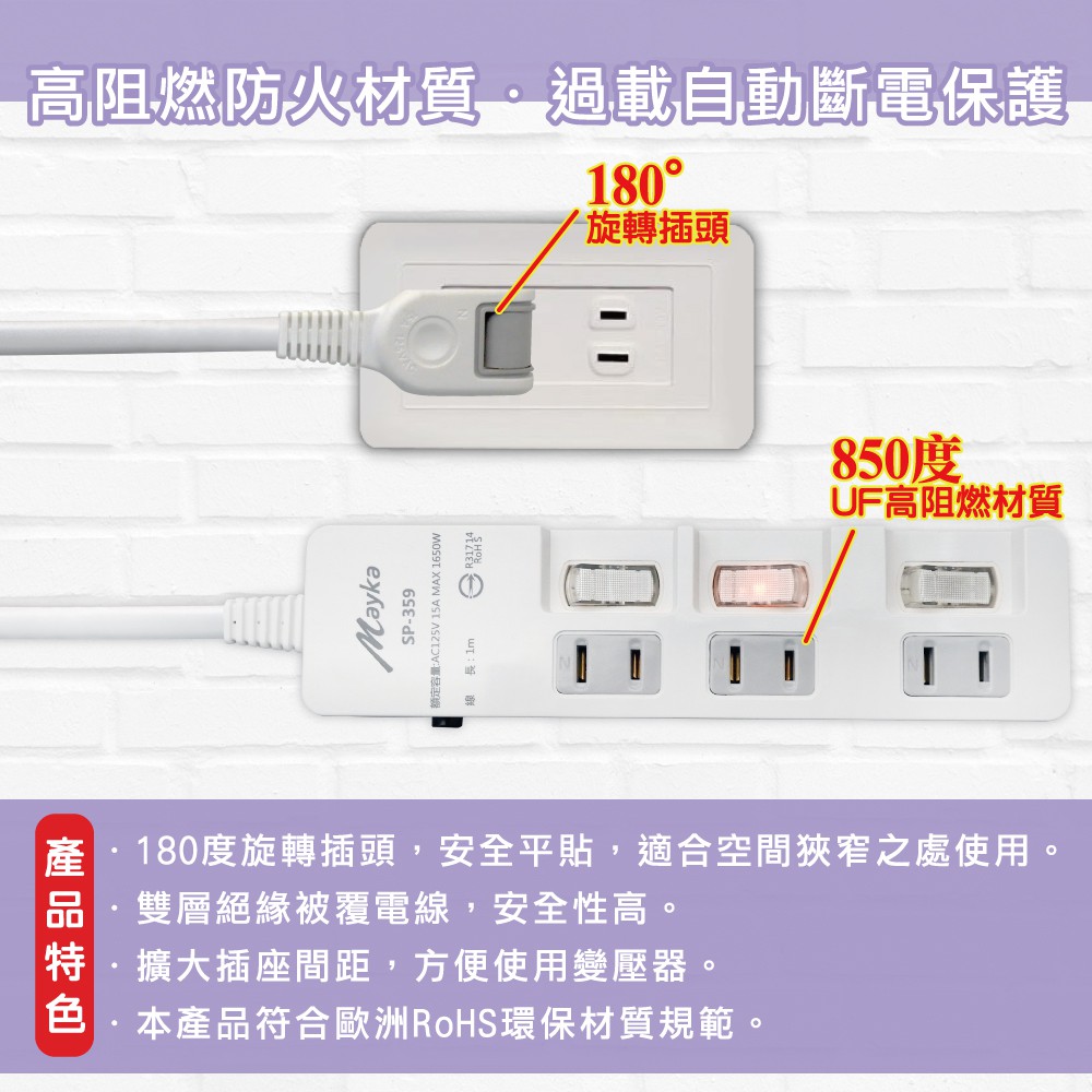 明家Mayka SP-359 2孔3開3插 1M加大間距 延長線180度平貼插頭獨立開關壁掛孔開關保護槽 現貨 廠商直送