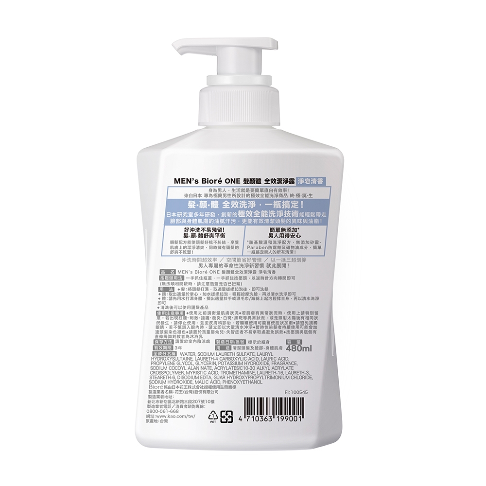 MEN'S Biore ONE髮顏體全效潔淨露-淨皂清香480ml【三友藥妝Tomod's】