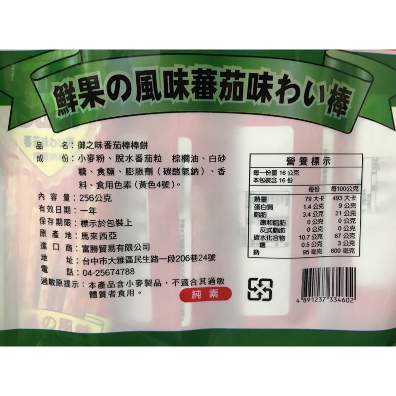 <佳泓零食行>富勝御之味蔬菜棒棒餅/番茄棒棒餅乾(16小袋入)蔬菜棒(全素)