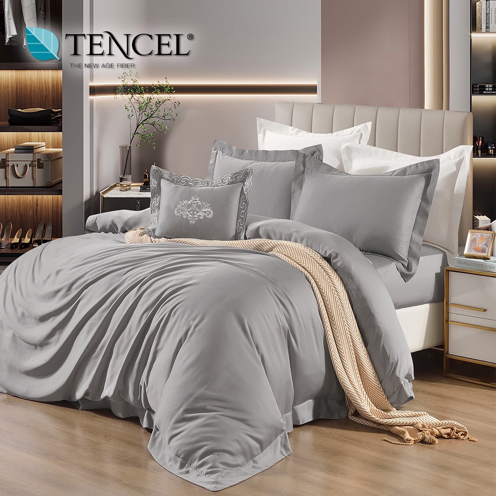 100支頂級尊爵素色天絲銀離子 【雙人 加大 特大組合】規格可選 兩用被床包+刺繡抱枕五件組