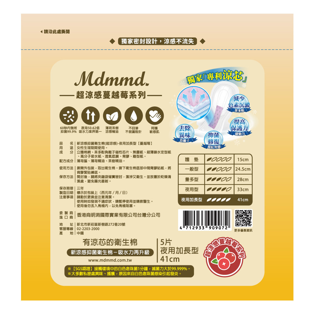 Mdmmd新涼感抑菌衛生棉(超涼感)夜用加長型【蔓越莓】 【任2件5折】
