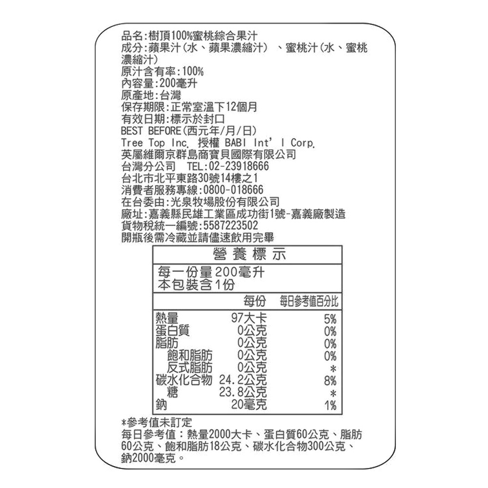 【樹頂】100%蜜桃綜合果汁200ML(利樂包)-city' super
