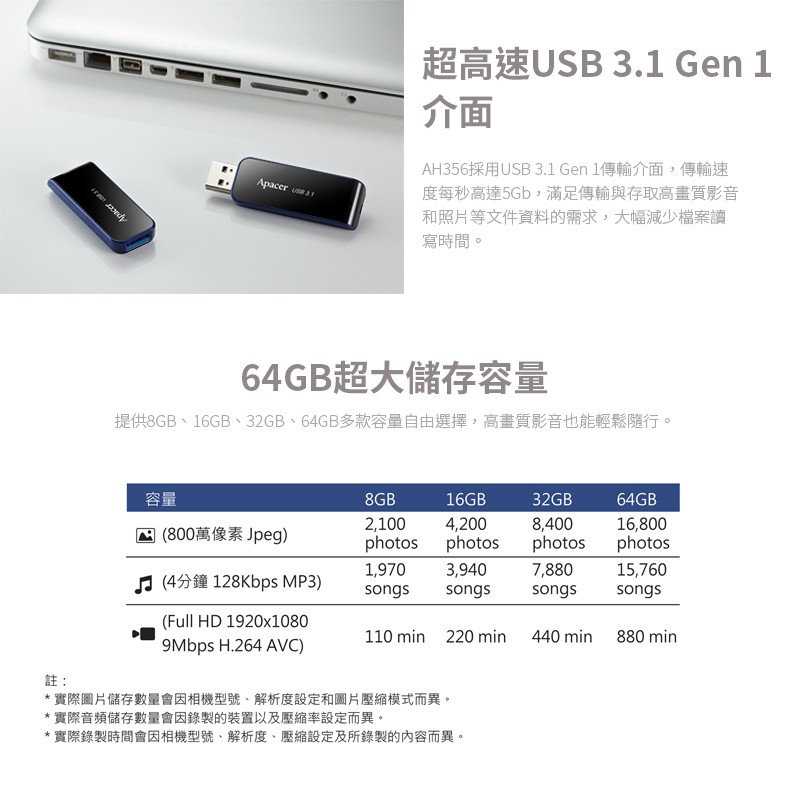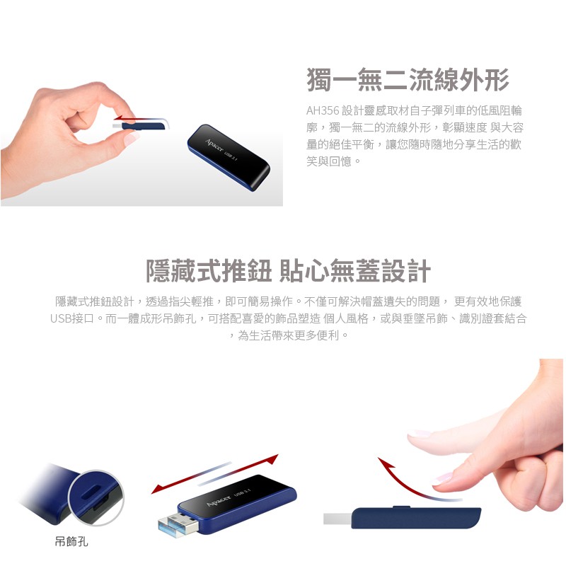 AFO阿福 新品 Apacer宇瞻 AH356 USB3.1 隱藏式推鈕隨身碟 32G/64G