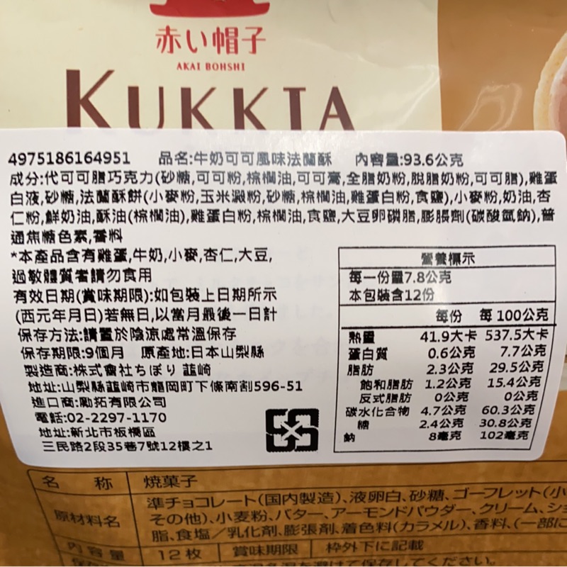 紅帽子 KUKKIA袋裝法蘭酥 - 牛奶巧克力/抹茶巧克力 10片入