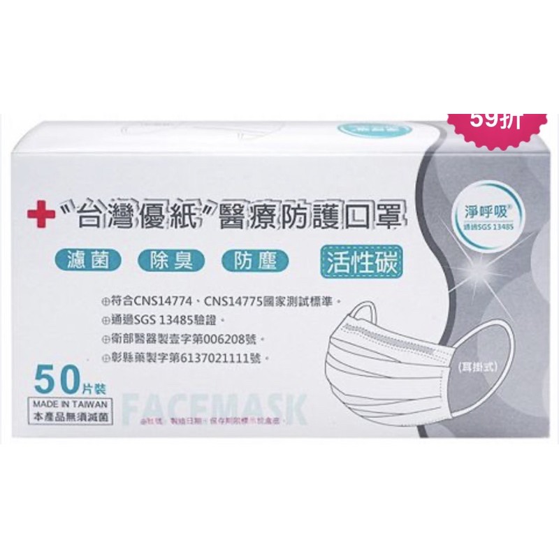 台灣優紙” 醫療用活性碳成人口罩 活性炭口罩 活性炭平面口罩 國家隊口罩 50入 台灣製 活性碳 外出必備