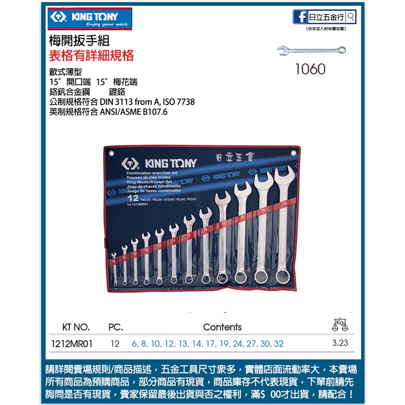 新竹日立五金《含稅》1212MR01 台灣製 KING TONY 梅開扳手12支組 1060系列