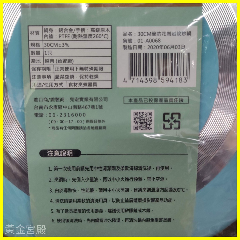 御膳坊 簡約 花崗岩紋 炒鍋 30cm SGS檢驗合格 不沾 不沾鍋 樺木手柄 PTFE 鐵氟龍 鍋 594183