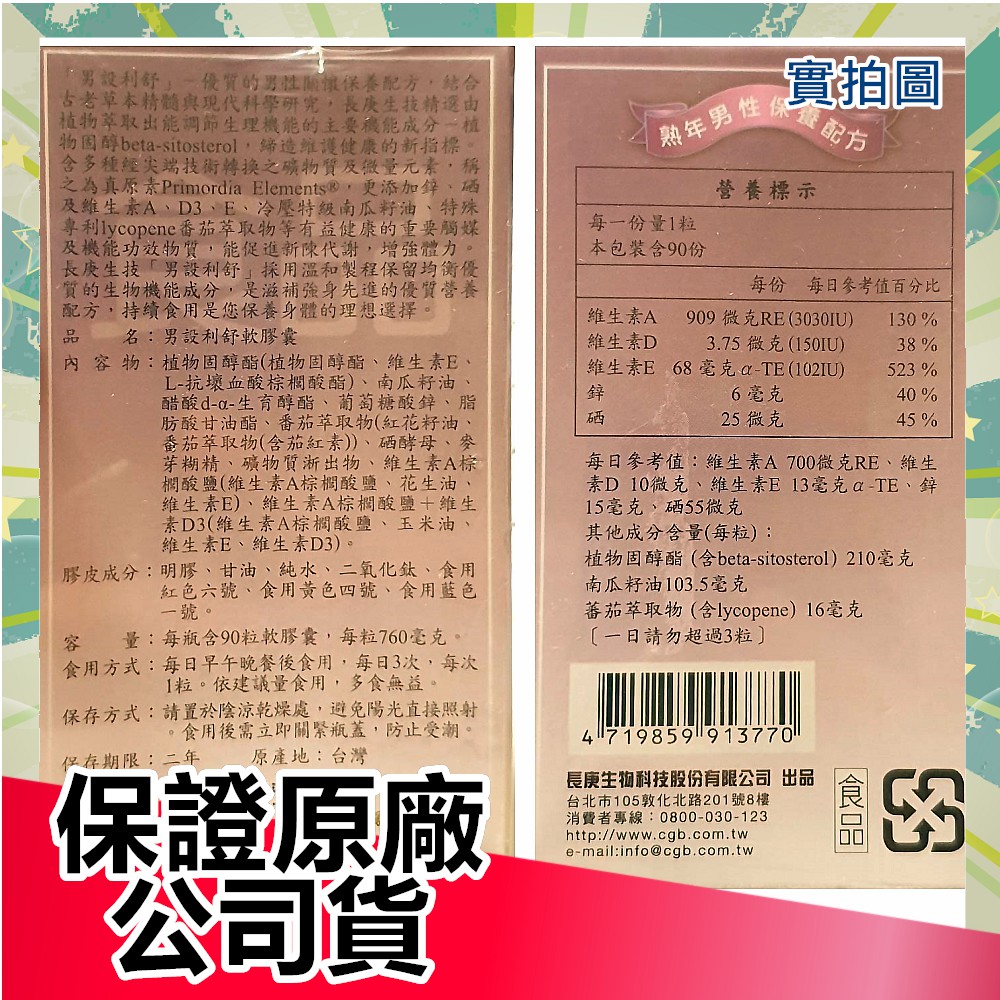 【保證公司貨】長庚生技 男設利舒 軟膠囊 90粒盒裝
