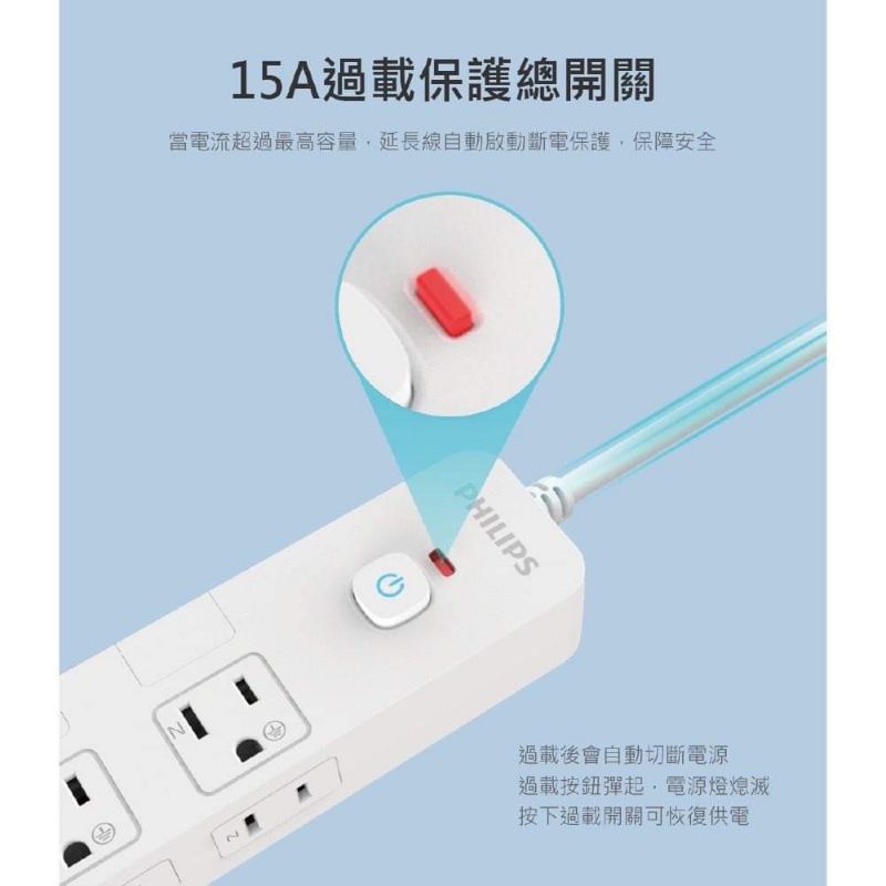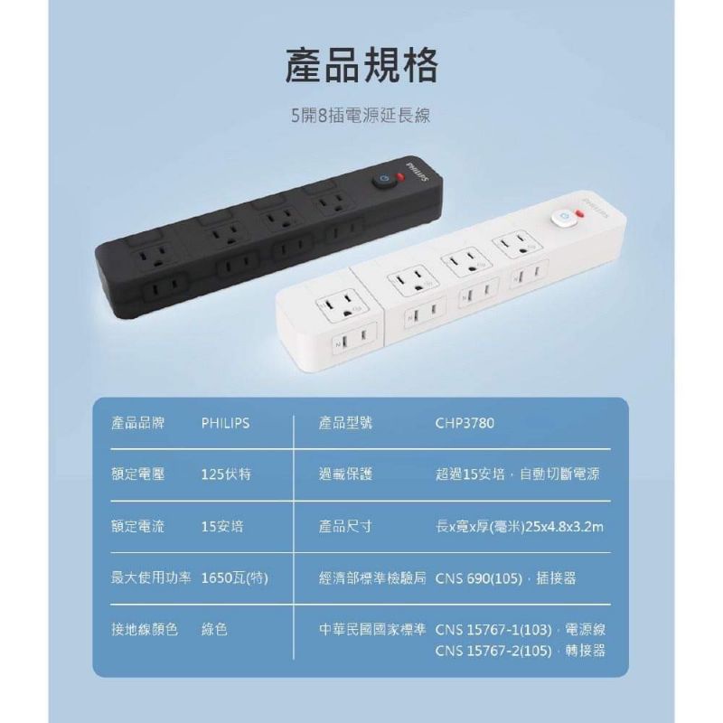 免運🌸PHILIPS 飛利浦 CHP3780 5開8插延長線 延長線 1.8M 新安全延長線 隱藏式開關設計 可壁掛
