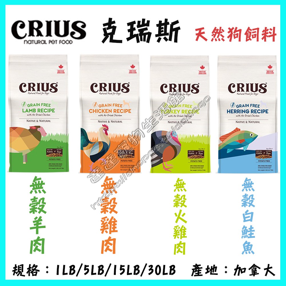 >達達寵物< 加拿大 克瑞斯 狗飼料 (無穀雞肉/無穀火雞肉/無穀羊肉/無穀白鮭魚) 狗乾糧 CRIUS