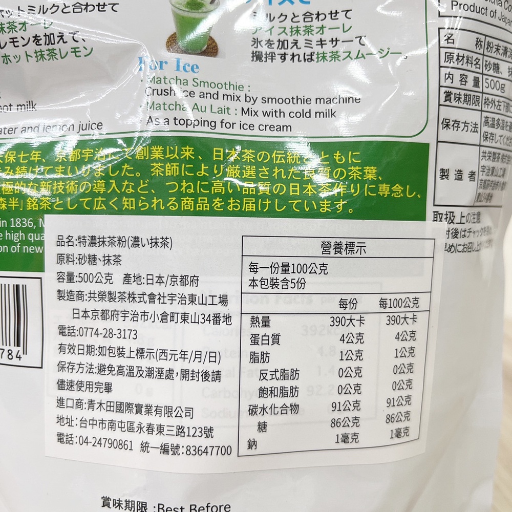 【柚子烘焙材料】森半 特濃抹茶粉 500G <特價> 有糖 日本森半 京都宇治特濃抹茶粉 飲品專用 開店原料