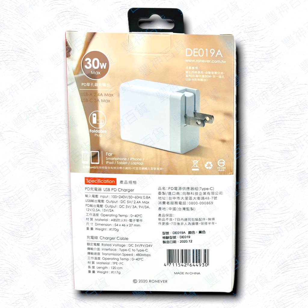RONEVER DE019A PD電源供應器組 充電器 黑色 Type-C 充電器 PD充電器 Type-C充電線