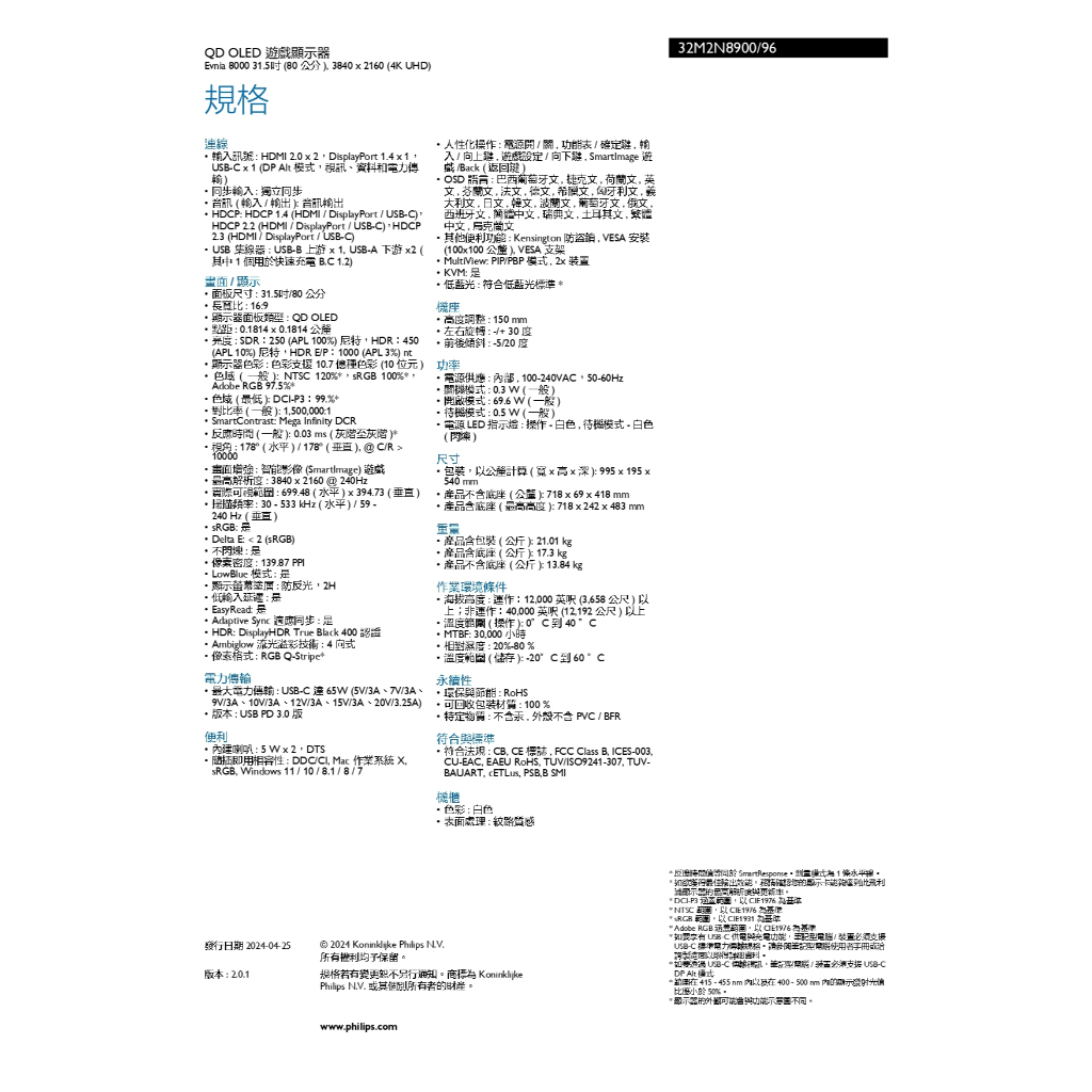 PHILIPS 32M2N8900 EVNIA 32型電競電腦螢幕(4K UHD/內建喇叭/HDR/240Hz)