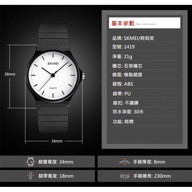 台灣出貨 時刻美 SKMEI 1419 男女 情侶 時尚簡約 PU錶帶防水運動手錶 電子錶 石英錶 超薄手錶 女錶