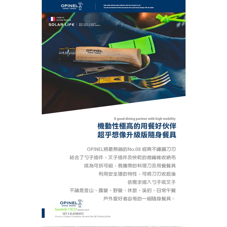OPINEL Picnic+ 游牧湯叉組/含No.08不鏽鋼折刀/收納布 OPI_002500 刀叉湯匙組 野營刀露營刀