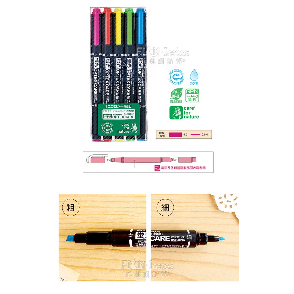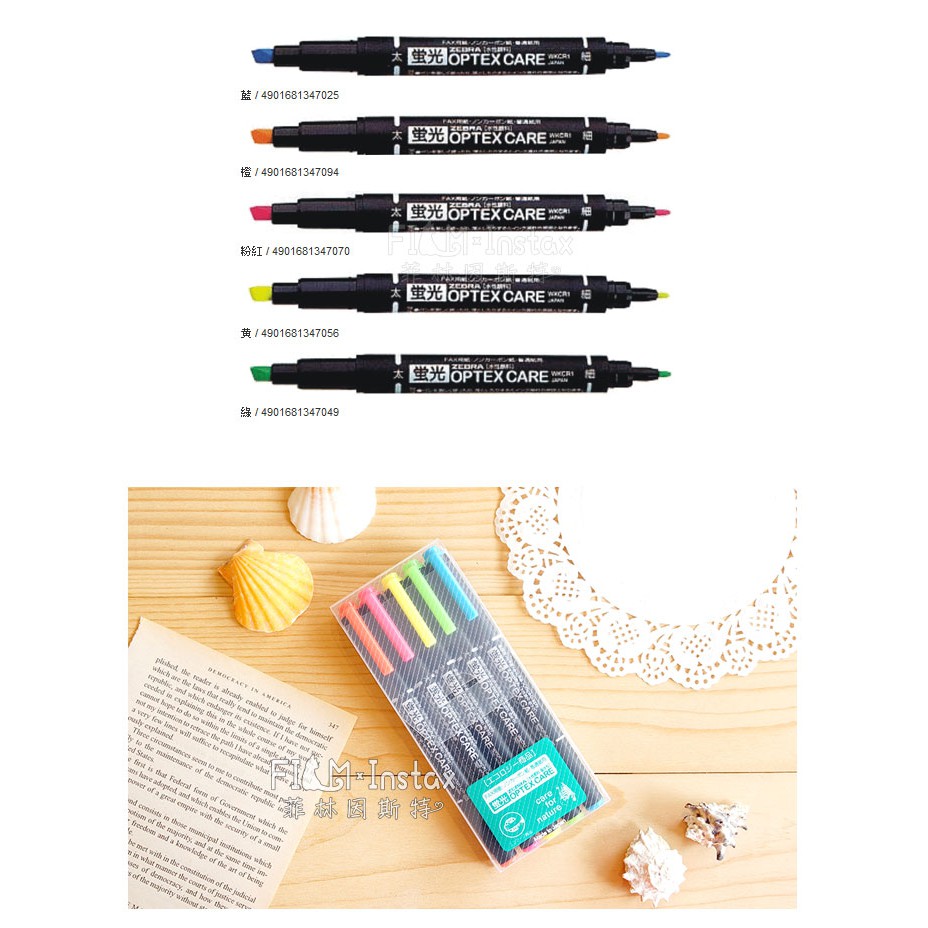 ZEBRA 斑馬 五色螢光筆組 水性 雙頭筆 WKCR1 OPTEX CARE WKCR1-5c 菲林因斯特