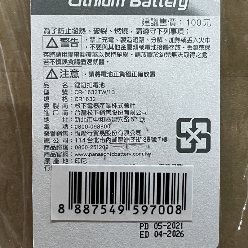 <現貨&蝦皮代開發票> 國際牌Panasonic CR1632 1入 水銀 鈕扣 相機 手錶電池 計算機 電子秤