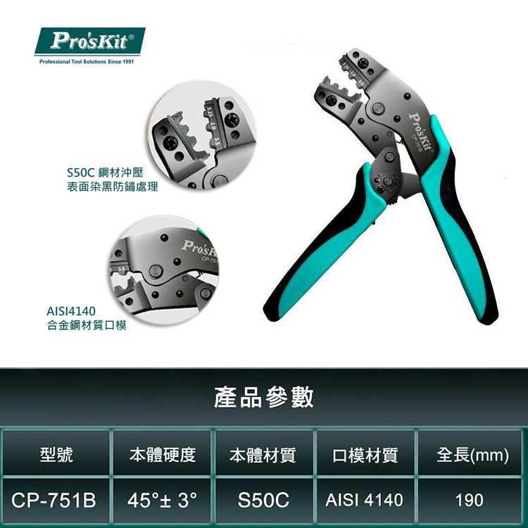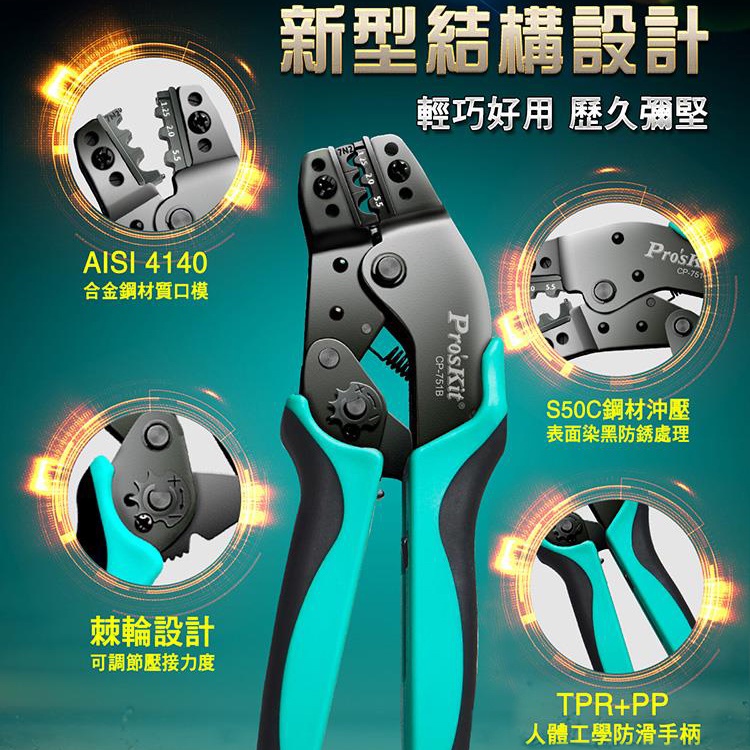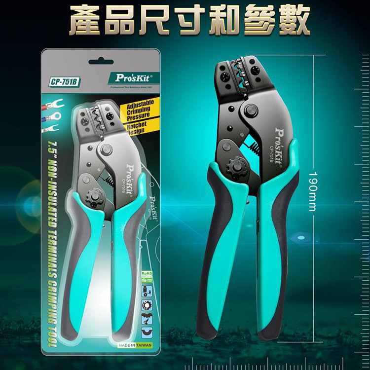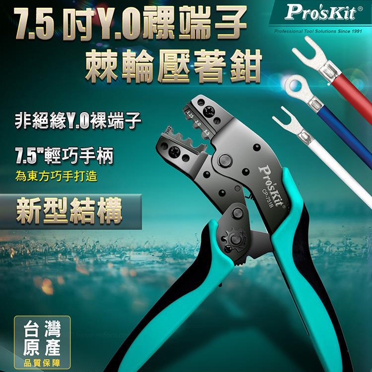 Pro'sKit 寶工 7.5吋端子鉗 Y.O裸端子棘輪壓著鉗 (CP-751B) Y端子 丸型端子 R端子 台灣製造