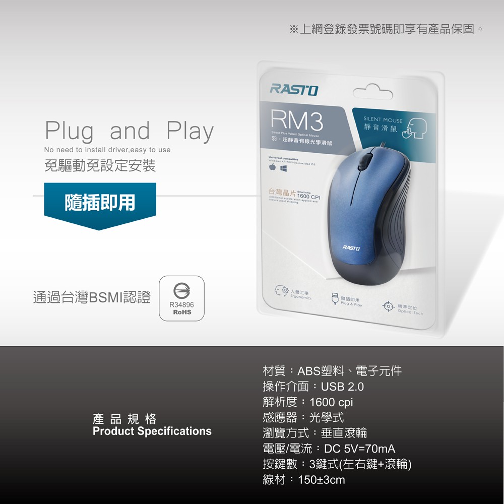 RASTO RM3 羽。超靜音有線光學滑鼠