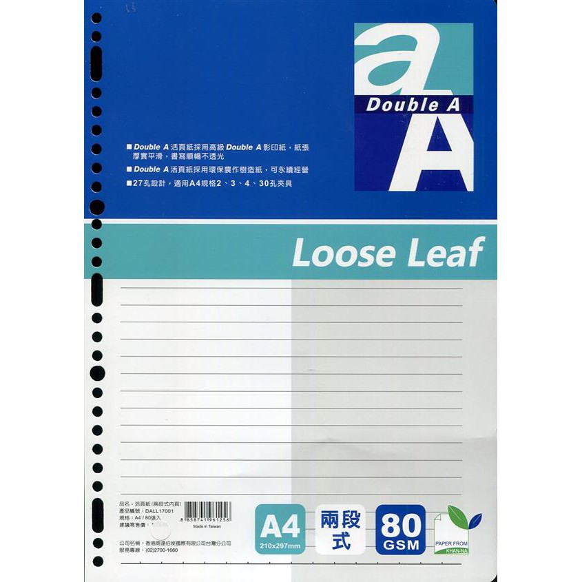 Double A A4 活頁紙 27孔 80張/本 橫線 空白 大格 方格 點點 兩段