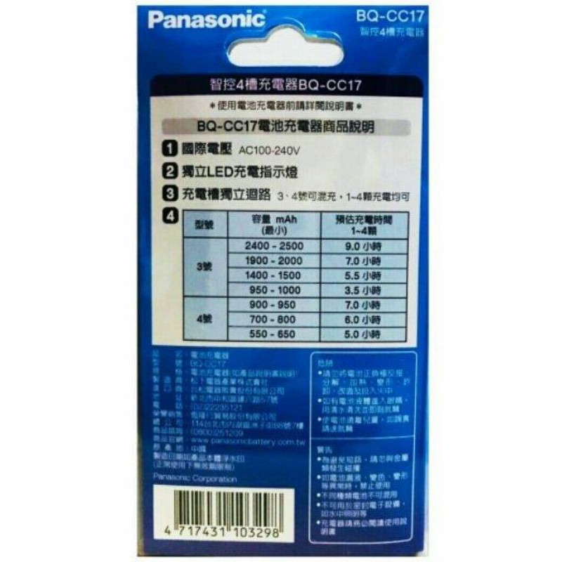 Panasonic eneloop 智控型4槽 鎳氫低自放充電器 BQ-CC17 國際牌台灣公司貨 可同時充三四號電池