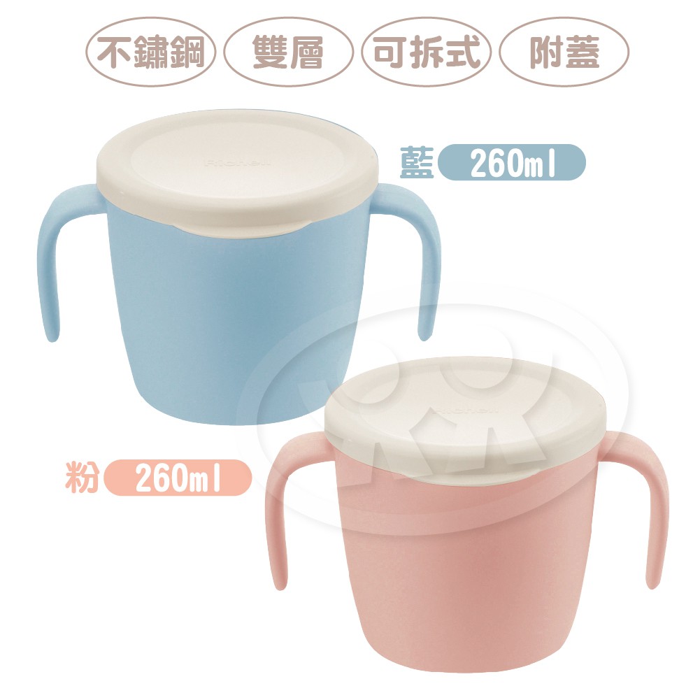 Richell 利其爾 TLI 雙層可拆式不鏽鋼雙耳杯 260ml 附蓋 粉紅/藍色/米色【宜兒樂】
