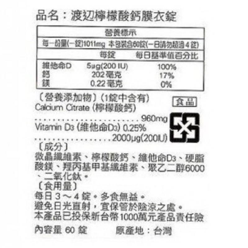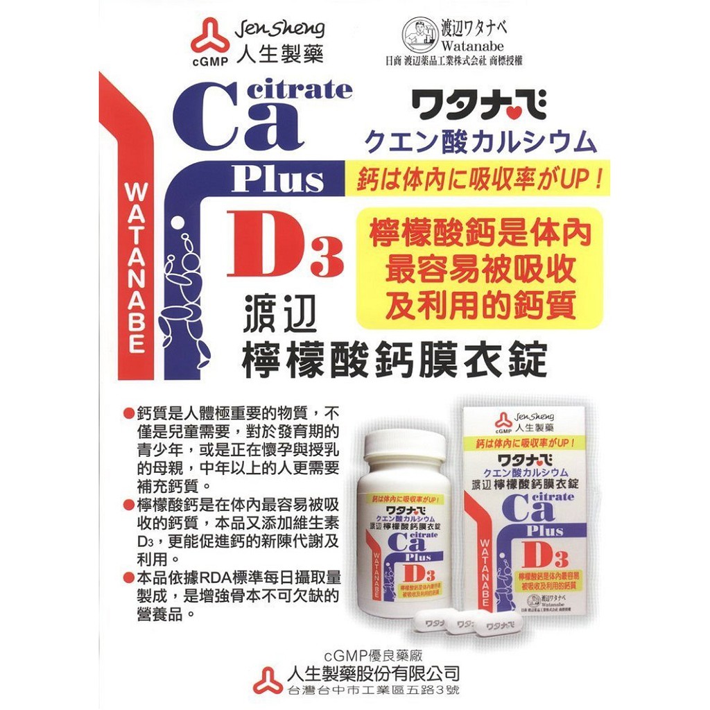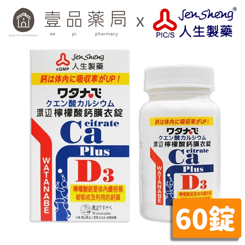 【人生製藥】渡邊 檸檬酸鈣 60粒/罐 膜衣錠 添加維生素D 200IU 【壹品藥局】
