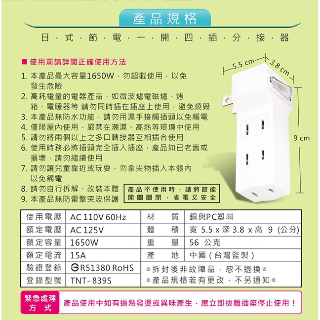 Dr.AV 聖岡科技 TNT-839S 日式節電1開4插分接器 插座 管控開關 阻燃防火 PC外殼 插頭 電器
