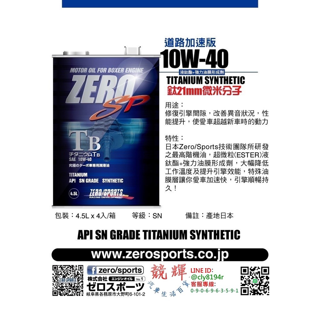 ☆競輝☆日本原裝進口 ZERO/SPORTS SP TB系列 10W-40 SN 液鈦酯類機油 4.5公升