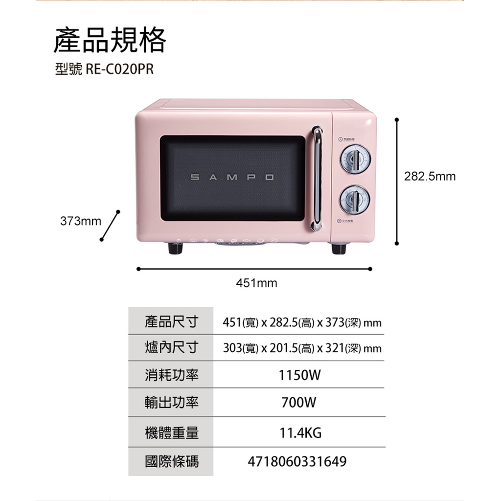 SAMPO聲寶 天廚20L經典美型機械式平台微波爐 RE-C020PR