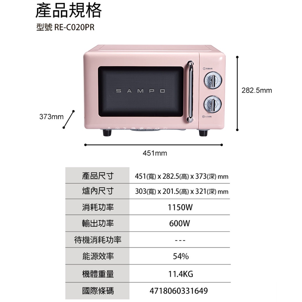 SAMPO聲寶 天廚20L經典美型機械式平台微波爐 RE-C020PR