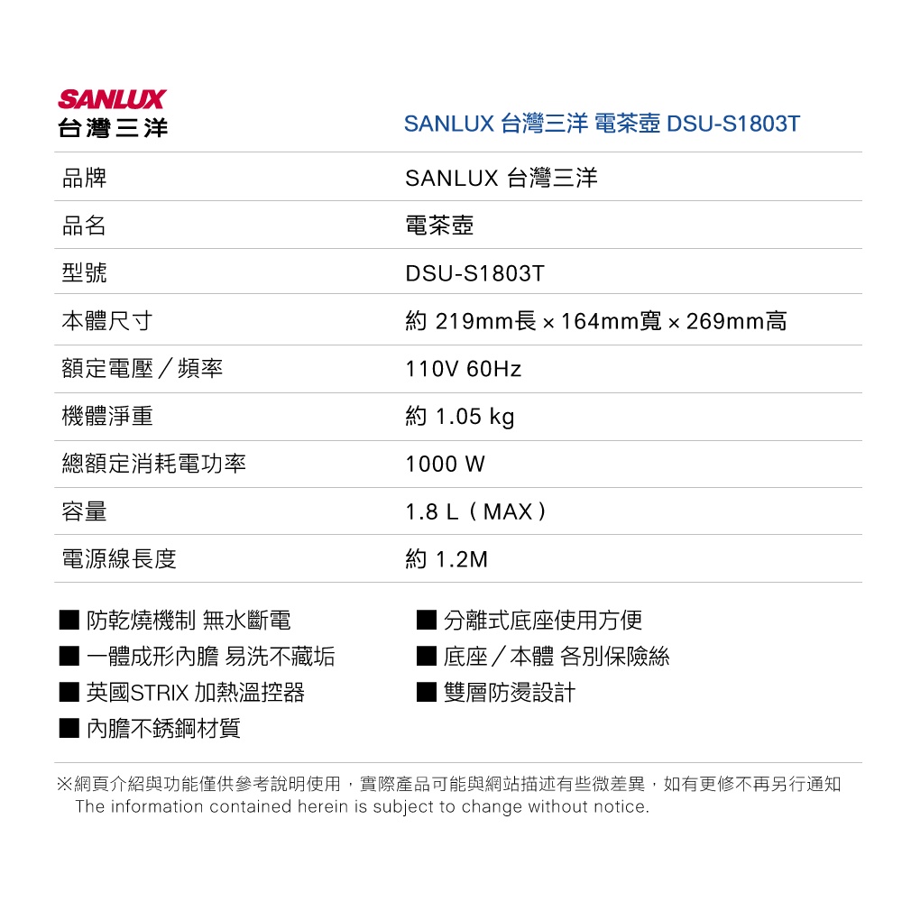 『福利品』SANLUX 台灣三洋 1.8L不鏽綱電茶壺 DSU-S1803T