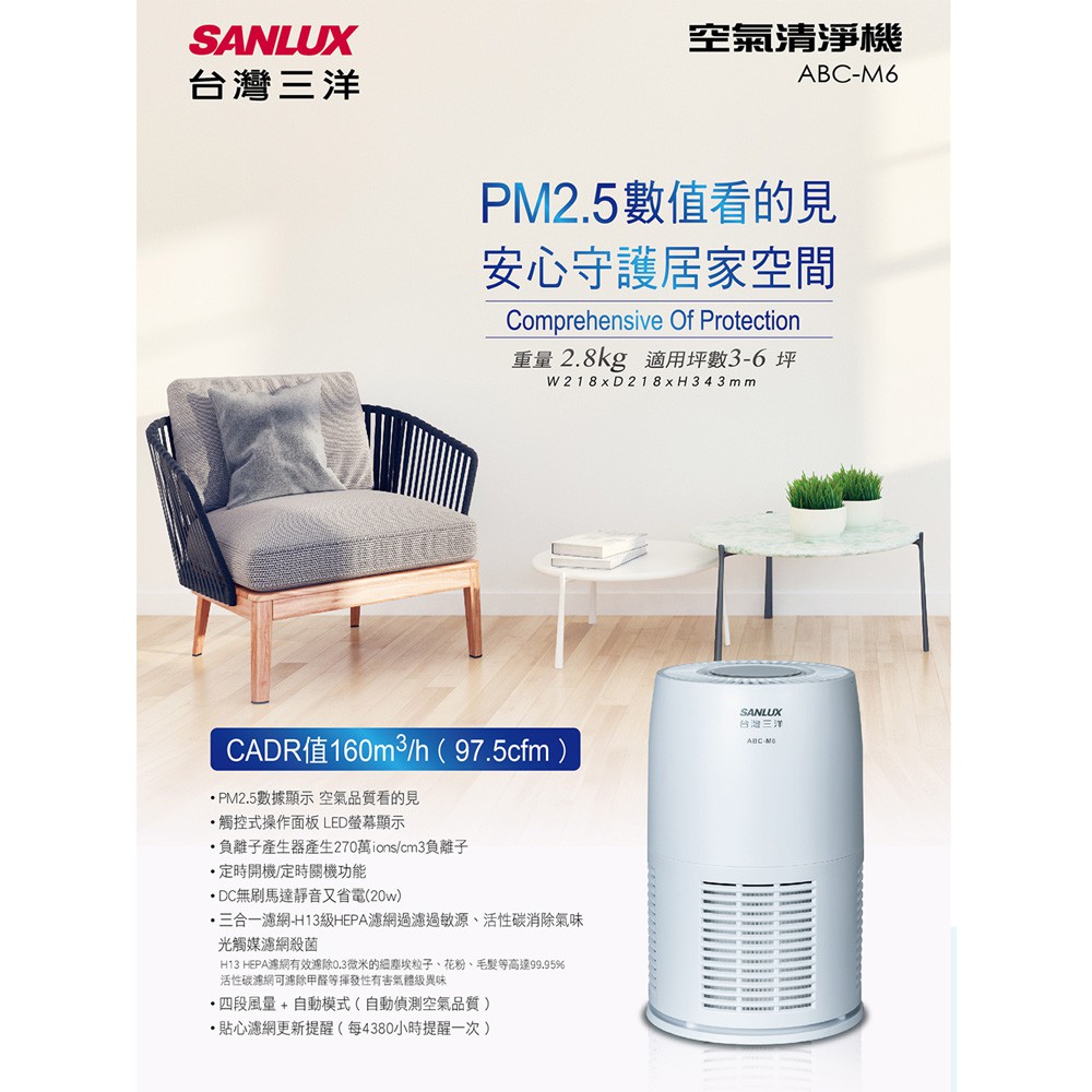 SANLUX 台灣三洋 3-6坪 負離子空氣清淨機 ABC-M6 現貨 廠商直送