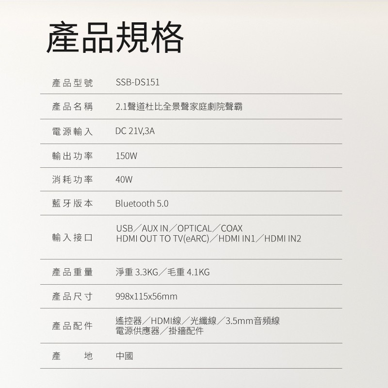 SANSUI山水 2.1聲道 杜比全景聲 家庭劇院聲霸 內建重低音喇叭 SSB-DS151 聲霸 現貨 廠商直送