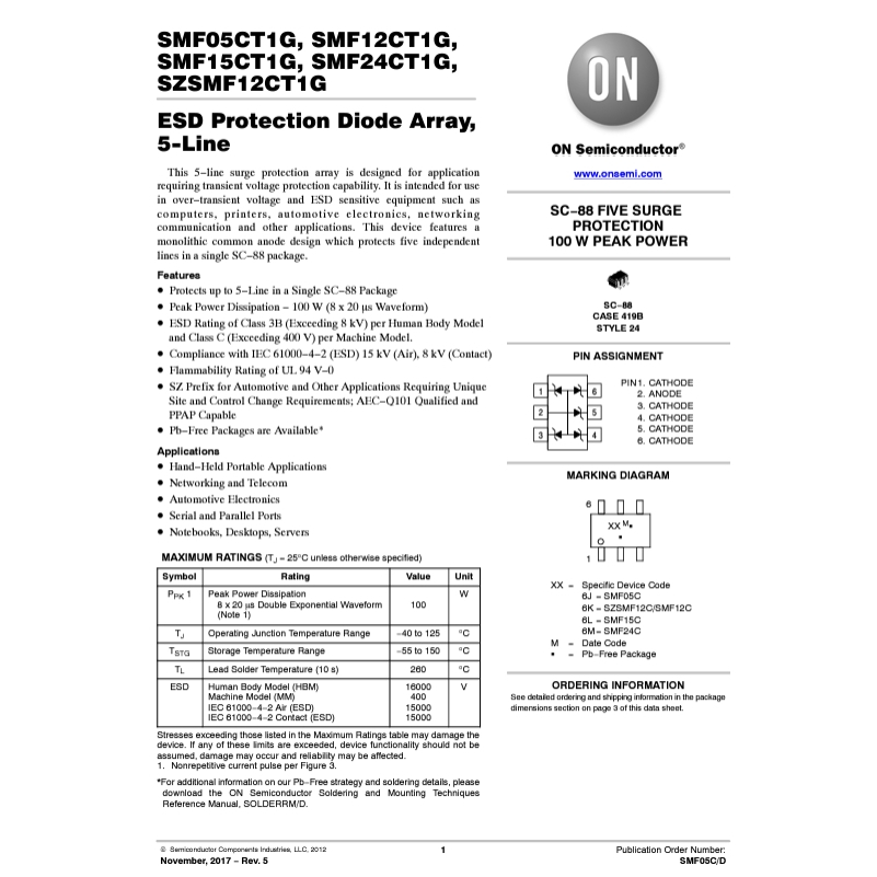 1PCS SMF05CT1G ON TVS DIODE 5VWM 12.5V SC88/SC70-6