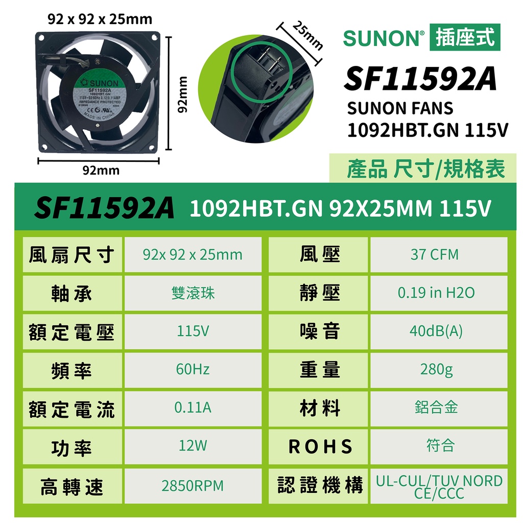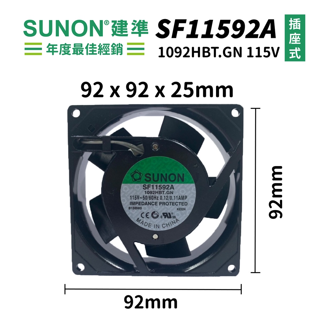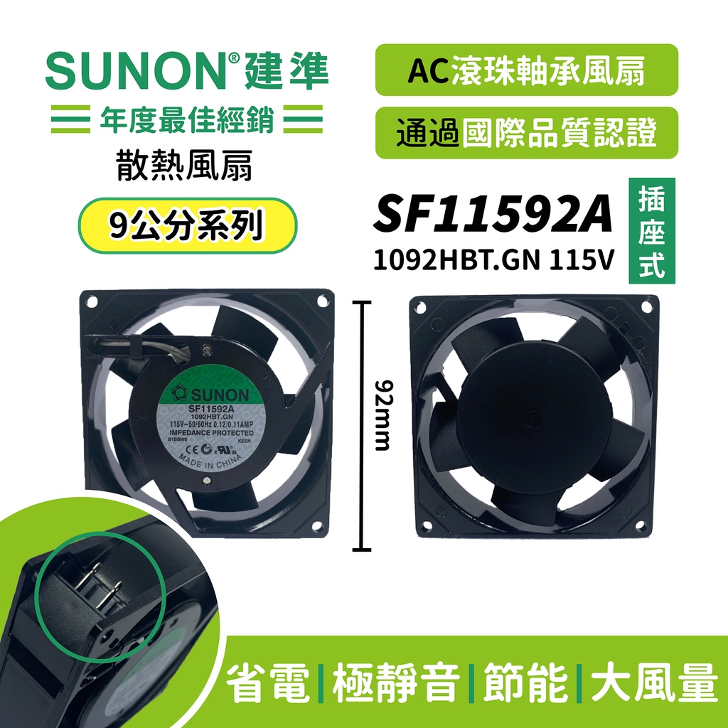 SUNON│建準 ★AC散熱風扇92mm★ SF11592A-1092HBT.GN 115VAC/插座式/原廠授權經銷