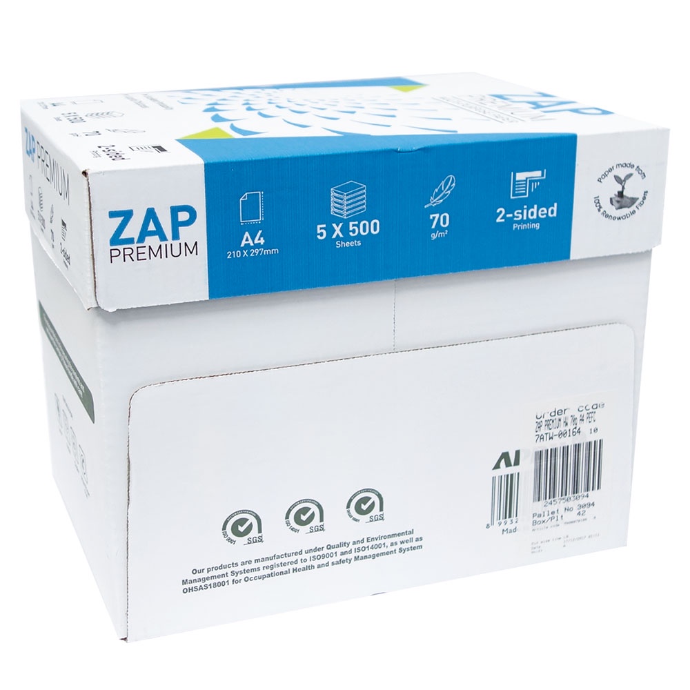 ZAP Premium 高階多功能影印紙 PEFC/A4/70g/500張/5包/箱 A4辦公室影印紙 白色|史泰博