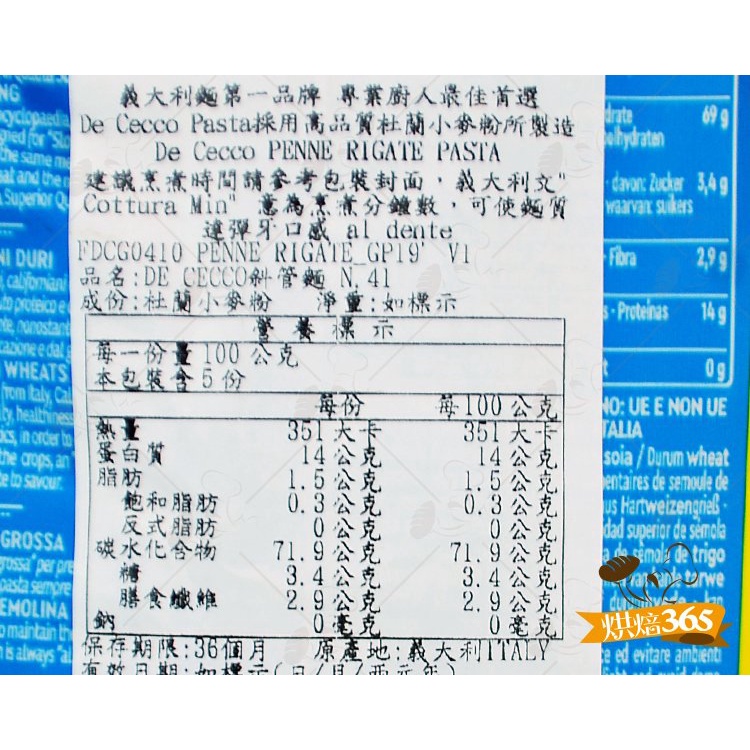 烘焙365*De-Cecco-N41斜尖管麵500g/包8001250120410