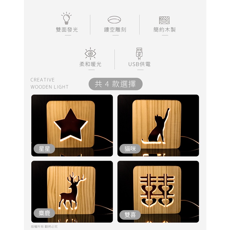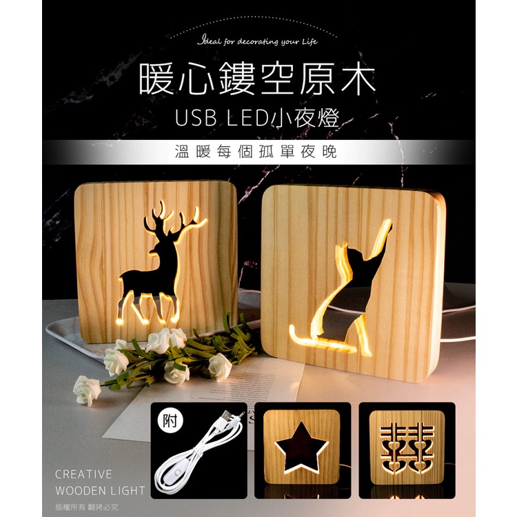 原木鏤空 USB LED小夜燈【現貨】原木相框 線控開關 交換禮物 裝飾燈 麋鹿 婚禮裝飾燈 相框小夜燈 實木夜燈
