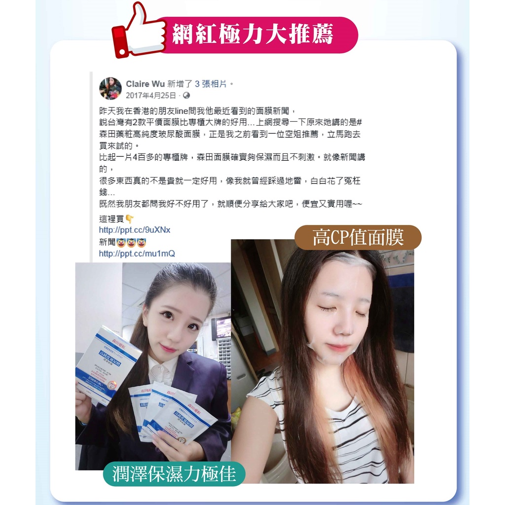 【森田藥粧】高純度玻尿酸潤澤面膜 10片/盒 森田藥妝面膜 森田藥妝 原液面膜 玻尿酸面膜 保濕面膜 森田面膜 森田